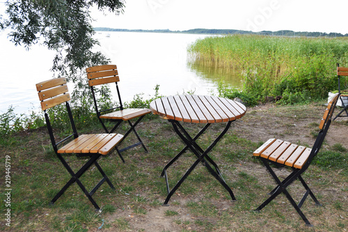 Fototapeta premium empty wooden table and wooden chairs by the lake