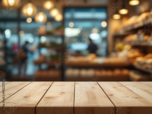 Obraz premium Empty wooden table in artisan bread market - minimalist bakery ambiance with...