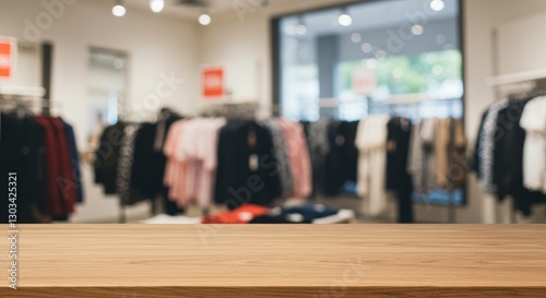 © Epic Photo, Obraz premium Empty Wooden Table in Clothing Store - A light brown wooden table in front of a blurred background of clothing racks in a store. Perfect for product placement