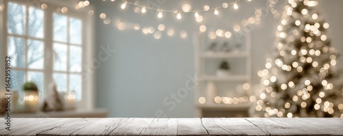 © Devi, Naklejka premium Empty wooden table in front of a blurred Christmas scene with a window, lights, and tree