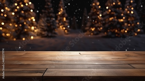 Obraz premium Empty wooden table in front of Christmas trees decorated with lights...