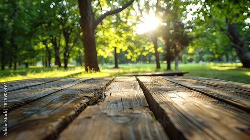 Fototapeta premium empty wooden table in green park rustic outdoor dining setup selective focus...