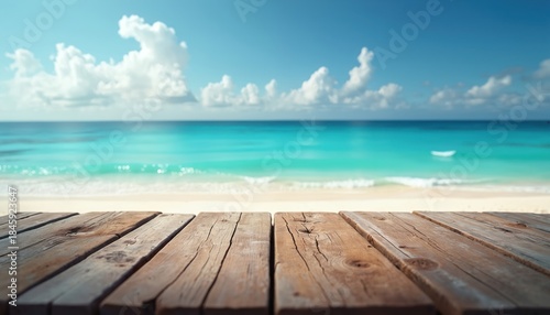 © miss irine, Obraz premium Empty wooden table on tropical beach overlooking ocean. Bright sunny day with clear blue sky and soft clouds. Perfect backdrop for summer product shots.