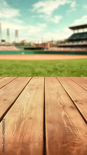 © Siasart Stock, Obraz premium Empty wooden table top with blurred baseball field background perfectly showcasing products effectively.