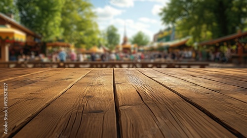 © Anna, Obraz premium empty wooden table with blurred bavarian oktoberfest on open air background