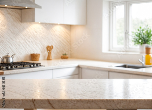 © bao, Fototapeta premium Empty wooden table with the bright white interior of the kitchen as a blurred background behind the bokeh