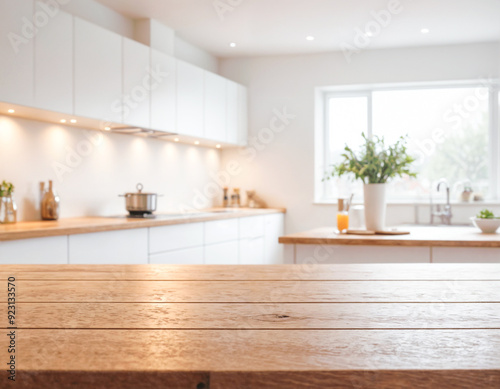 © bao, Fototapeta premium Empty wooden table with the bright white interior of the kitchen as a blurred background behind the bokeh