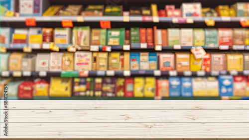 © Perecciv, Naklejka premium Empty wooden tabletop with blurred supermarket background for product display