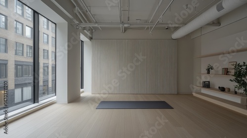Fototapeta premium Empty yoga with large windows and minimalist decor.