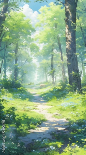 © liang, Obraz premium Enchanted Anime-Style Forest with Whimsical Banners: A Mystical Woodland Setting for Game Art and Storybook Illustrations, Perfect as 4K Wallpaper Art.