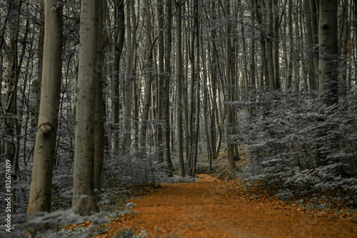 Fototapeta premium enchanted autumn atmospheric dramatic forest panoramic landscape with high trees