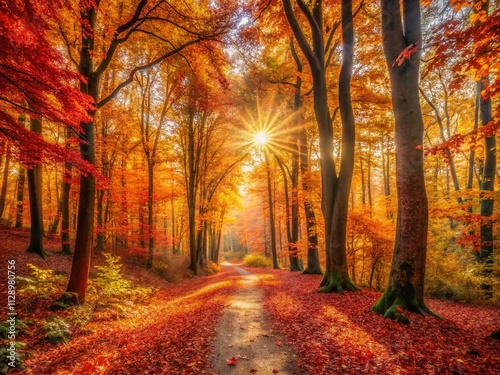 Obraz premium Enchanted Autumn Forest: A Panoramic View of Vibrant Leaves and Warm Light...