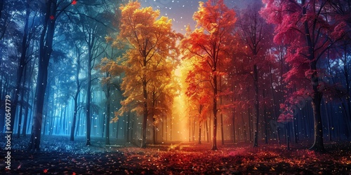 Naklejka premium Enchanted Autumn Forest Landscape with Vibrant Colors and Mystical Atmosphere