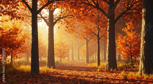 © Satriyo, Fototapeta premium Enchanted Autumn Forest Path Sunlit Golden Leaves and Misty Morning