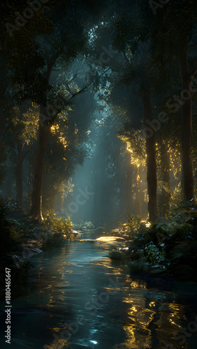 © BI.I, Obraz premium enchanted bioluminescent forest at night with glowing lights reflecting in a mystical river stream