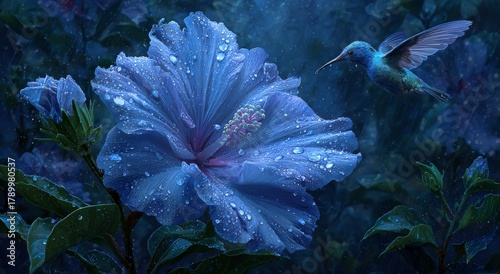Fototapeta premium Enchanted Blossom: An ethereal blue hibiscus flower glistens with morning dew, as a hummingbird approaches, wings in mid-flight, creates a magical scene