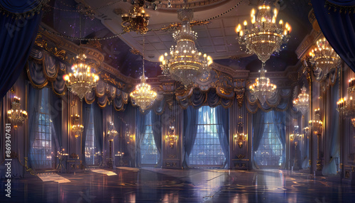 Obraz premium Enchanted Castle Ballroom: A fairy tale castle ballroom adorned with grand chandeliers, opulent draperies, and sparkling crystal accents