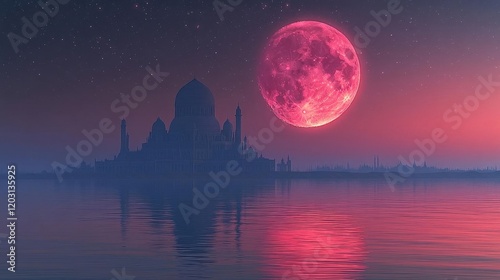 © MuhammadFaiz, Naklejka premium Enchanted Castle Under a Crimson Moon at Night