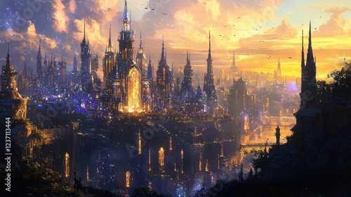 © Kitta Studio, Fototapeta premium Enchanted Cityscape at Dusk with Magical Towers and Soft Glow