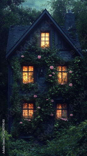 Fototapeta premium Enchanted Cottage at Night: A Magical Forest Home