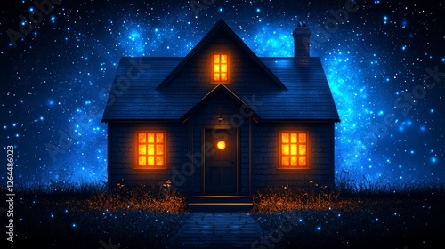 Fototapeta premium Enchanted Cottage Night Scene Cozy Winter Home Illuminated Under Starry Sky...