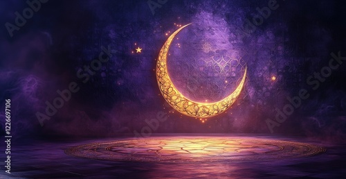 Fototapeta premium Enchanted crescent moon glowing in a mystical landscape with swirling purple mist and stars