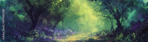Fototapeta premium Enchanted Dreamland - Fantasy Forest in Vibrant Greens and Purples, Digital Painting of Mystical Landscape with Magical Atmosphere