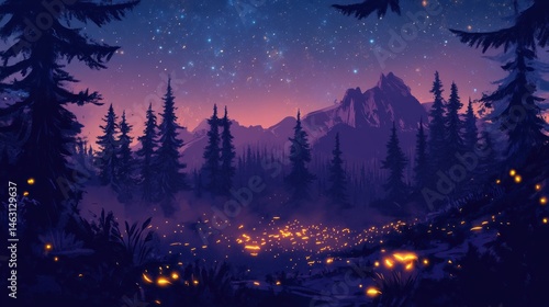 © purnama, Naklejka premium Enchanted evening, A forest bathed in starlight and mystical glows