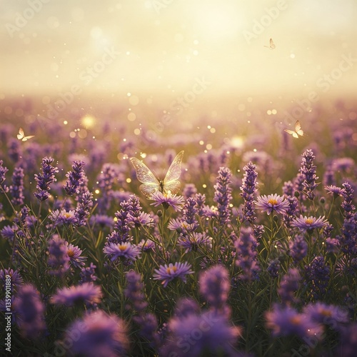 © JIN, Naklejka premium Enchanted Fairy Forest with Glowing Flowers and Magical Light