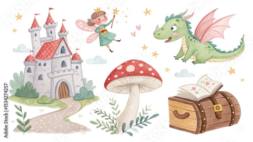Obraz premium Enchanted Fairytale Illustration Castle, Dragon, Fairy, Mushroom, and Treasure Chest