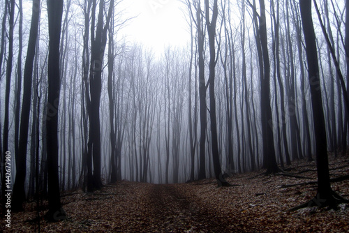 © Андрій Лис, Naklejka premium Enchanted fog envelops a mystical forest with shafts of light breaking through dense tree canopies