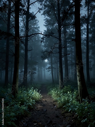 Obraz premium Enchanted foggy forest under moonlight.