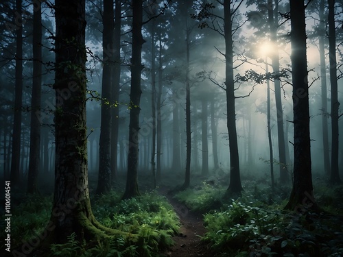 Obraz premium Enchanted foggy forest with moonlit serene glow.