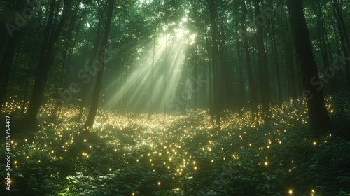 © AgungRikhi, Fototapeta premium Enchanted Forest at Dawn: Fireflies Illuminate a Mystical Woodland Scene