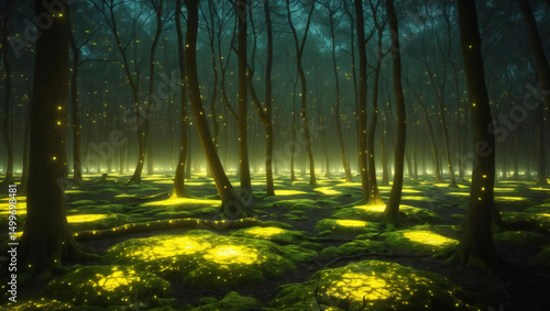 Fototapeta premium Enchanted Forest at Night Magical Firefly Glow in Mystical Woods