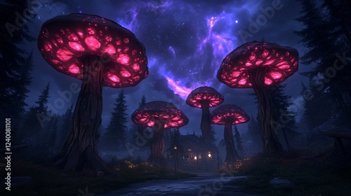 Naklejka premium Enchanted forest at night with glowing, bioluminescent mushrooms illuminating...