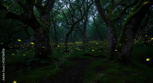 © VuongThien, Naklejka premium Enchanted Forest at Twilight: Fireflies Dancing in the Summer Night AI Generated