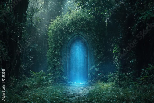 © SuperStockGallery, Obraz premium Enchanted Forest Doorway - Magical Blue Door in Lush Greenery.