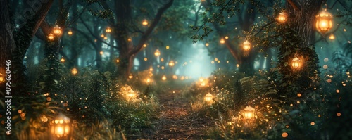 © Viacheslav, Naklejka premium Enchanted Forest Fairy Lanterns, 4K hyperrealistic photo