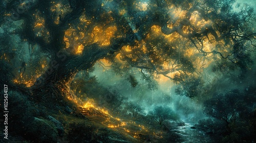 © Infinity, Fototapeta premium Enchanted Forest: Glowing Trees and Mystical Stream