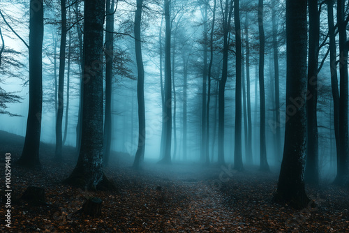 Fototapeta premium Enchanted Forest in Soft Fog at Dusk