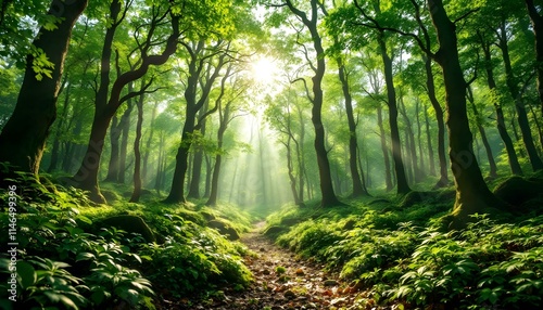 Obraz premium Enchanted Forest Landscape with Brilliant Sun Rays Piercing Through Trees...