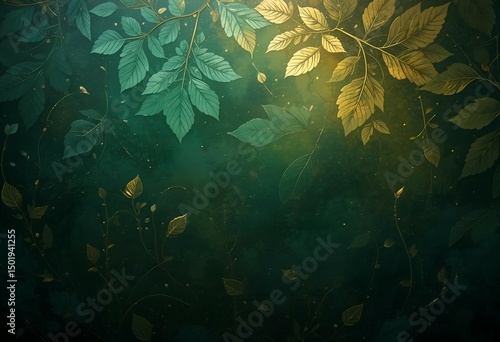 © Lashan, Fototapeta premium Enchanted Forest Leaves Background - Dark Green and Gold Botanical Texture