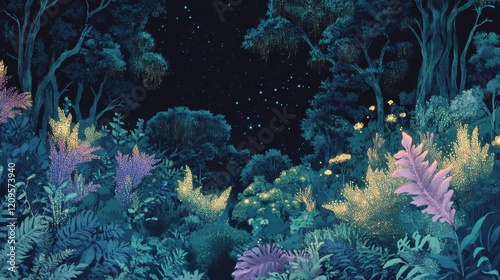 © novian, Obraz premium Enchanted Forest Night Scene Glowing Plants and Stars