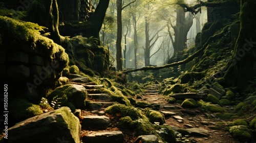 Obraz premium Enchanted Forest Path: A Mystical Journey Through Mossy Stone Steps