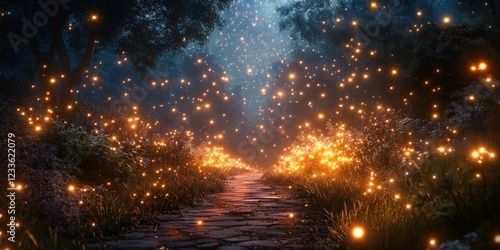 Naklejka premium Enchanted Forest Path: A Night of Fireflies