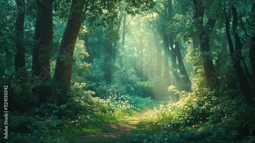 Obraz premium Enchanted Forest Path: A Sunlit Walk Through Lush Greenery