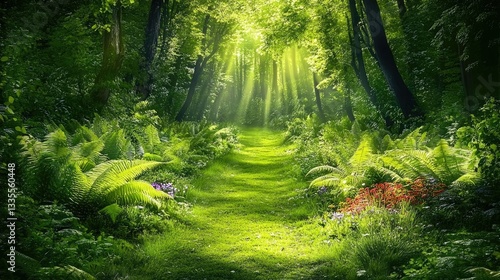 Obraz premium Enchanted Forest Path: A Sunlit Walk Through Lush Greenery