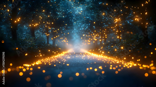 Naklejka premium Enchanted Forest Path at Night with Glowing Lights and Magical Atmosphere