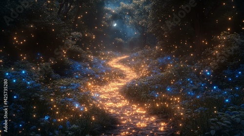 Naklejka premium Enchanted Forest Path at Night with Glowing Lights and Moonlight